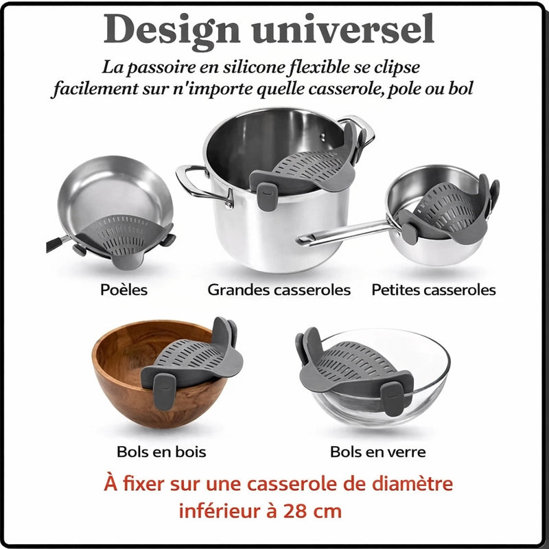 Absolument! Notre égouttoir est conçu en silicone ultra-flexible avec des clips robustes qui s'ajustent parfaitement à la plupart des casseroles, poêles et bols. C'est la solution universelle pour un drainage sans souci, garantissant une compatibilité maximale avec vos ustensiles de cuisine existants.